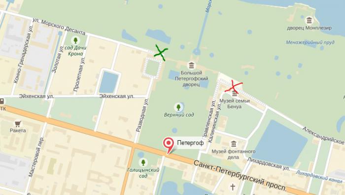 На всякий случай, на карте покажу второй вход/выход из Нижнего парка (зеленый крестик). Когда мы шли назад, очередь там была раза в два меньше, чем где мы заходили (красный крестик).