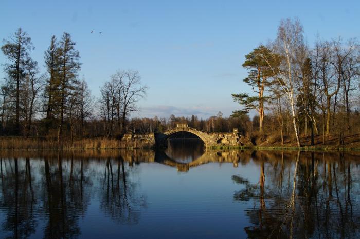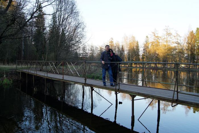 Вообще, мосты в этом путешествии тоже сыграли большую роль и часто будут упоминаться. К примеру, строящийся мост через речку Ниша, где сотни автолюбителей стоят часами в пробках. Но не будем о наболевшем. Продолжая тему мостов, могу с уверенность сказать, что в Гатчинском парке их за десяток. Вот вам мост к дворцу. Его, правда, за нами почти не видно