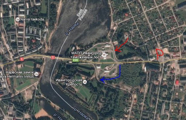 На всякий случай, покажу на карте (P – там можно оставить машину, синяя стрелочка – это дорога вдоль пограничного поста к Ивангородской крепости, красная стрелочка – пешеходная дорога к таможне)