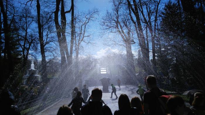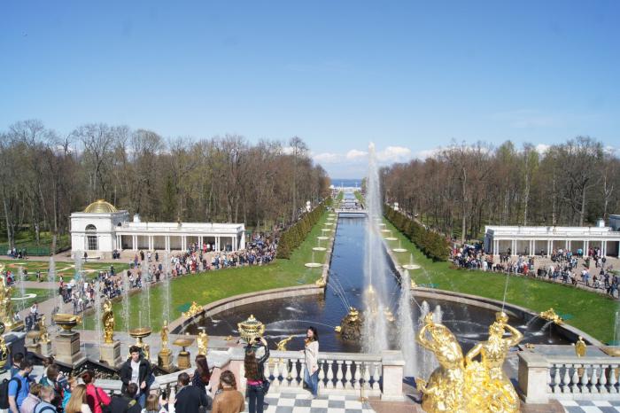 Все, конечно же, классно, красиво, но миллионы туристов, шум, суета до конца не дают расслабиться и проникнуться всем этим величием. Поэтому мы быстро пробежались по основным достопримечательностям, не забыв намокнуть под фонтаном шутихи, кинуть в ботфорты Петра монетку, за что нас, правда, поругала мимо проходящая женщина-экскурсовод, полюбоваться заливом и бесконечными «Метеорами», привозящими/увозящими толпы туристов из/в Питер(а), а ещё наблюдали зрелище, когда в определенное время часть аллеи хорошенько орошается струями воды и, не зная этого, можно вымокнуть до нитки.