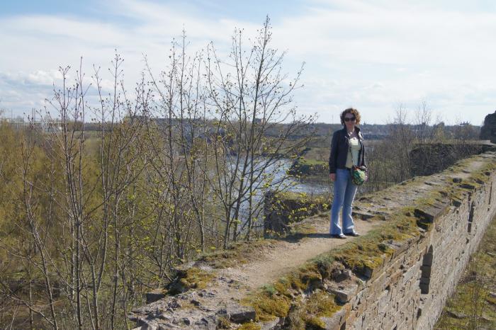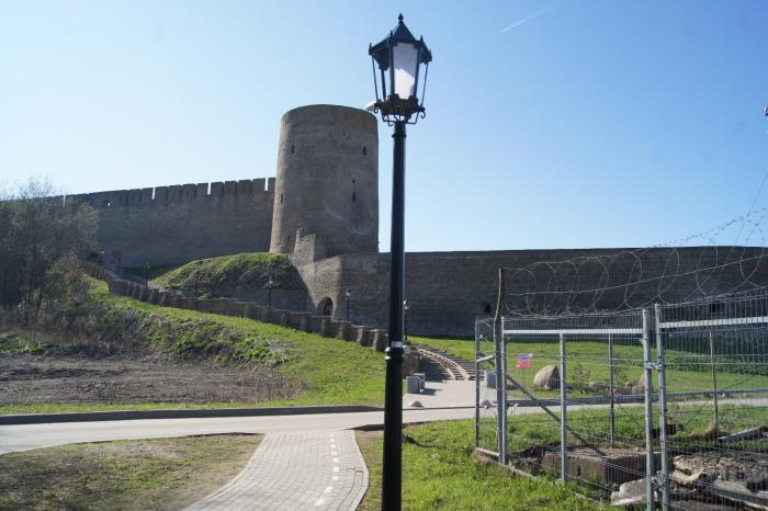При въезде в Ивангород каждую машину останавливают на предграничном посту и задают различные вопросы, типа: «Цель ваше визита? Есть ли у вас спец.пропуск? И т.д.» Мы сказали, что хотим посмотреть крепость, пропуска у нас нет, но есть визы с действующим шенгеном. Проверив наши загранпаспорта и убедившись, что всё в порядке, погранец, нахмурившись, сказал: «Если что, то вы на КПП». Мы догадались, что на приграничных территориях действуют какие-то свои правила и порядки, молча уверенно кивнули и поехали дальше. Поставив машину на стоянку (бесплатно), рядом с дорогой, которая ведёт к границе, мы пошли узнавать у пограничников, как попасть в крепость. Нам сказали, что вдоль пограничного забора можно смело пройти, хотя есть централизованный вход, но он был далеко от нас.