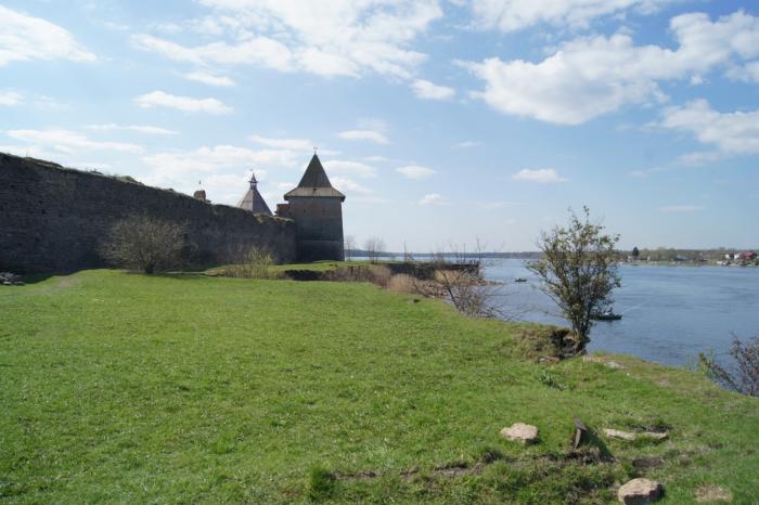 Была возможность присоединиться к экскурсии, этим воспользовались Люба и Олег, мы же самостоятельно решили изучить памятник архитектуры. Итак, Орешек. На Ореховом острове в истоке Невы в 1323 году была основана крепость. Откуда появилось название, я думаю, догадываетесь. Ну а с начала XVIII крепость стала использоваться как тюрьма. Крепость очень сильно пострадала в ходе Великой Отечественной войны. В 1941—1943 гг. в течение 500 дней небольшой гарнизон из бойцов 1-й дивизии войск НКВД и моряков 409-й морской батареи Балтийского флота оборонял крепость от немецких войск, которым так и не удалось переправиться на правый берег Невы, замкнуть кольцо блокады Ленинграда и перерезать дорогу жизни. Ежедневно на крепость обрушался тысячный град снарядов, но стены продолжали прочно оберегать бойцов. Говорят, что потери были только тогда, когда солдаты пытались обратно поднять советское знамя, и в этот момент их настигала шальная пуля или снаряд.