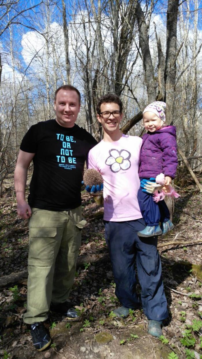 Первой точкой нашего маршрута (45 км от Гатчины) были барские владения нашего друга Алексея. Туда мы заехали ненадолго, чтобы передать подарочек и немного пообщаться. Леша показал нам дом, участок, даже вывел в лес, где его любимая такса уже вовсю охотилась на ежей и спешила поделиться добычей с гостями, громко оповещая об этом лаем. Таким образом, мы вычислили её местоположение и спасли ежика.