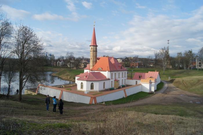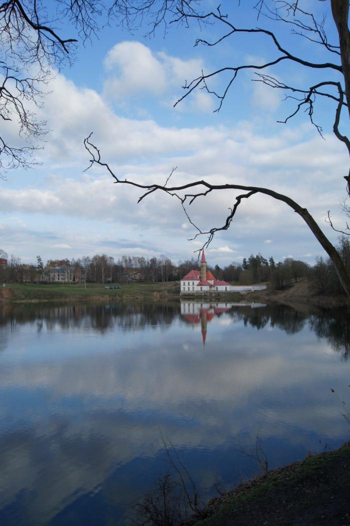 Около половины шестого подтянулись ребята. Мы встретили их приветственными напитками возле машины, а они нас куличом и крашенными яйцами, которые приготовила Люба. Вместе мы пошли гулять по ещё неизвестной нам Гатчине. Маршрут наш лежал через парковую зону с озёрами и дворцами. Первый на пути попался Приоратский дворец, расположенный на берегу Черного озера. Дворцом назвать его, конечно, сложно, так — домик с башенкой. Но выглядит очень уютненько, к сожалению, ни мы, ни Люба с Олегом внутрь так и не попали. Как выяснилось, это единственное сохранившееся в России архитектурное сооружение, построенное, в основном, по технологии землебита: слои спрессованного суглинка (почва с преимущественным содержанием глины и значительным количеством песка) пропитываются известковым раствором.