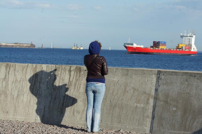 В общем, часа через 2 мы покинули Петергоф и направились в сторону Кронштадта, а это всего 35 километров. Так что через каких-то 30-40 минут, мы парковали нашу машину недалеко от Петровского парка. Очень понравилась насыпная дорога к Кронштадту (часть КАДа), разделяющая Финский залив и Невскую Губу, на которой есть свой «Эресуннский тоннель».