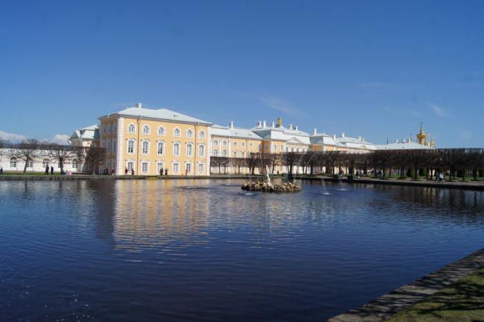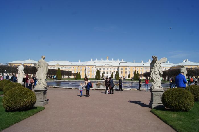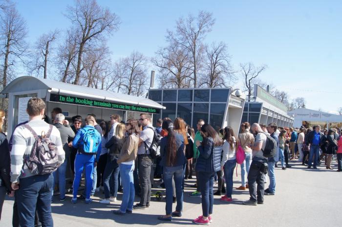 мы убедились, что фонтаны работают и пошли в направлении Нижнего парка. И тут она – родная: очередь. Есть 2 варианта приобретения билетов: через электронные автоматы и через обычную кассу. Отличие: только в кассах можно купить льготные билеты, и, соответственно, очередь туда раза в два, а то и в три, больше. Но и электронные автоматы постоянно глючат из-за большого количества операций. Хорошо, что их быстро реанимируют. Итог: около 25 минут в очереди, цена билета — 700 р. на одного (450 р. льготникам) без посещения дворцов. К сожалению, в понедельник дворцы не работали.