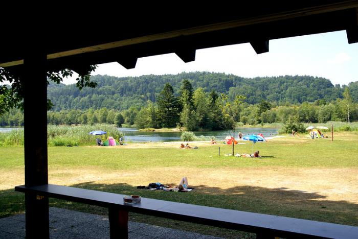 У самого берега тебя встречают рыбы (прикормленные, наверное). Вода чистейшая и сладкая на вкус. Дно ровное и песчаное. Для малышей насыпан и выгорожен отдельный пляжик из песка на мелководье. Есть хороший помост для заныривания. В лучших традициях эстетов имеется островок, поросший деревьями, а для купающихся на открытой воде заякорены два дощатых плота (с цивильными металлическими лесенками для подъема).
