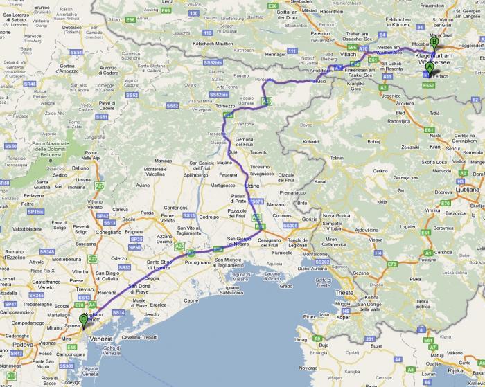 Путь от Клагенфюрта до Венеции проходит все время по скоростному автобану E66-E55/A2-A23-A4, и по расчетам мы должны были потратить на него около 3 часов. Учитывая промах при съезде на Местре, а также блуждание по незнакомым улочкам и неразбериху с итальянскими дорожными порядками (нелегко перестроиться после австрийских привычек), получилось побольше. Зато когда мы запарковались у отеля и получили ключ от номера, состояние эйфории было совсем рядом.