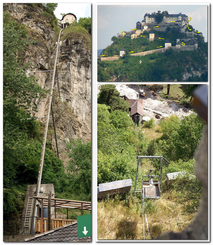 Есть пассажирский лифт — эдакая небольшая кабинка, поднимающаяся по изогнутому рельсу (+5 евро к стоимости билета). А есть грузовая канатка, с помощью которой доставляют грузы в верхний двор. Я видел, как из транспортной люлбки выгружали продукты для ресторана. На автомобиле наверх, по моему, вообще подняться нельзя.