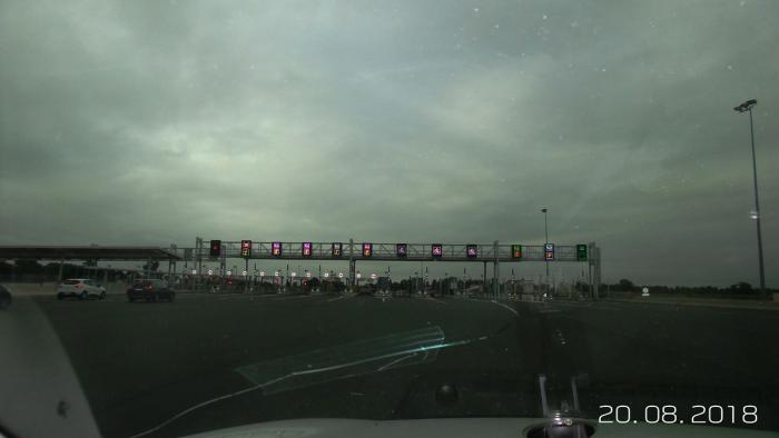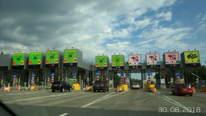 Стикер на оплату. Подъехал, нажал кнопку, вылезла картонка и открылся шлагбаум. Проехал по платной, вставил стикер, оплатил и свободен. 11,5 евро максимально, 1,5 евро минимальная оплата.