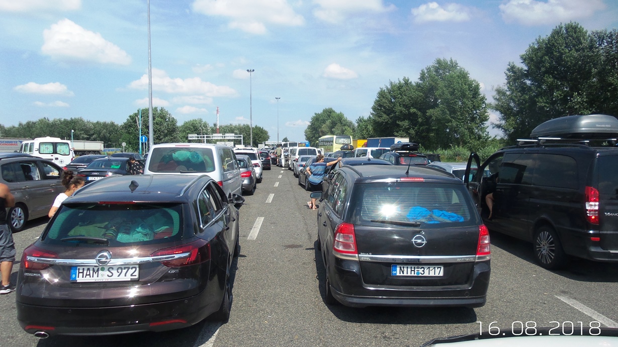 Выехали не торопясь, хорошо позавтракав в отеле, пообщались на форумах. Почему-то, на всякий случай, посмотрели, сколько надо ехать до «Парижу». К обеду достигли Сербско-Венгерской границы. По ощущениям здесь ещё больше машин, да и достаточно жарко стоять. Те же 3 часа простоя. Венгры ещё и машины успевают типа осмотреть и задать вопрос о сигаретах. Народ беснуется, время от времени клаксоны начинают будить погранцов венгерских. Демократия у них неторопливая. Глядя на нервничающих людей, с улыбкой вспоминаю свой 27 часовой простой в очереди на Керченскую переправу в 2014 году.