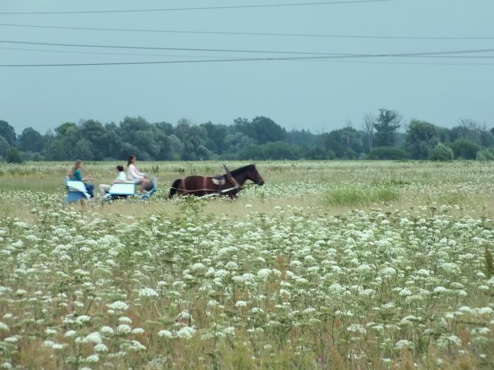 На лугу растут редкие виды растений. Растительность, действительно, буйная, высокая — идти среди неё по тропинке особенно приятно. Уже через несколько минут понимаешь: с каждым шагом громкое заявление на плакате становится правдивее и весомее. Душа радуется и бежит вслед за конной повозкой.