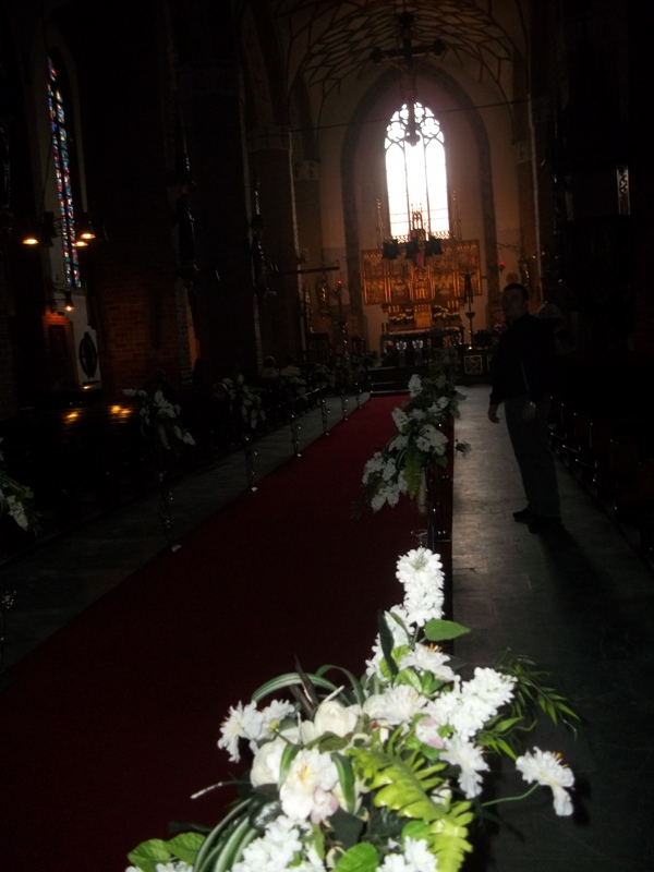 От Замка мы прогулялись до Высоких (Верхних) ворот, единственных сохранившихся из трех ворот, которые вели в Ольштын сквозь оборонительные стены. Позже Ворота использовались для хранения оружия, затем были перестроены в тюрьму, потом переданы городу под полицейский участок. Сейчас в них располагается гостиница. У готической кафедральной базилики святого Якова мы повстречали красивую невесту в окружении нарядных гостей, которые томились в нетерпеливом ожидании начала венчания.
