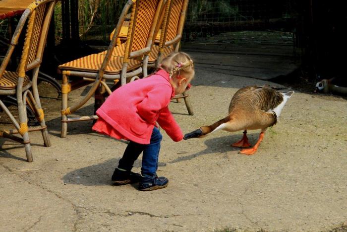 Перекусили в кафе пиццей и сосисками с картошкой фри. Дочка подкормила отдыхавшего рядом гуся