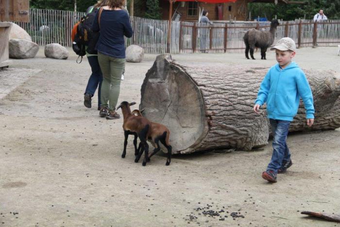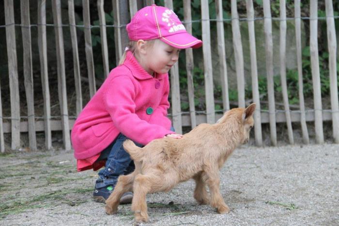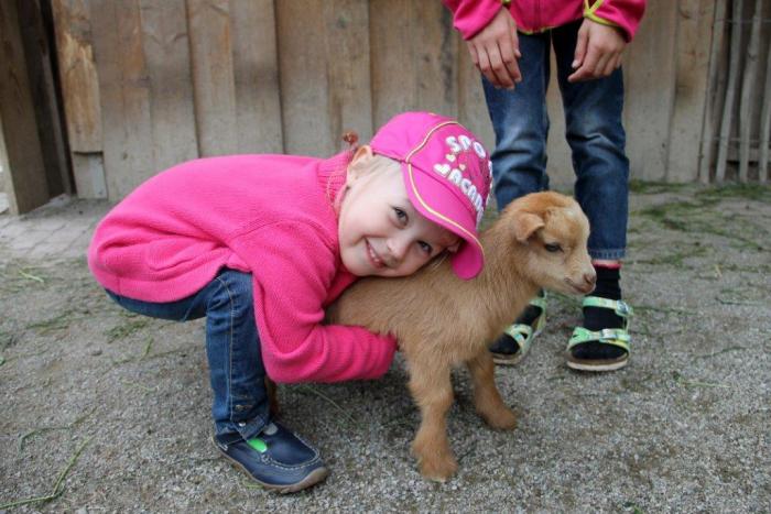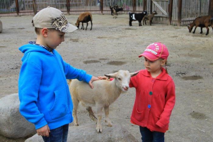 Уже собирались уходить, но увидели загончик с козочками и ягнятками — задержались там почти на час. Животные абсолютно ручные, стоит только присесть сразу забираются на колени, очень ласковые. Дети были в восторге!