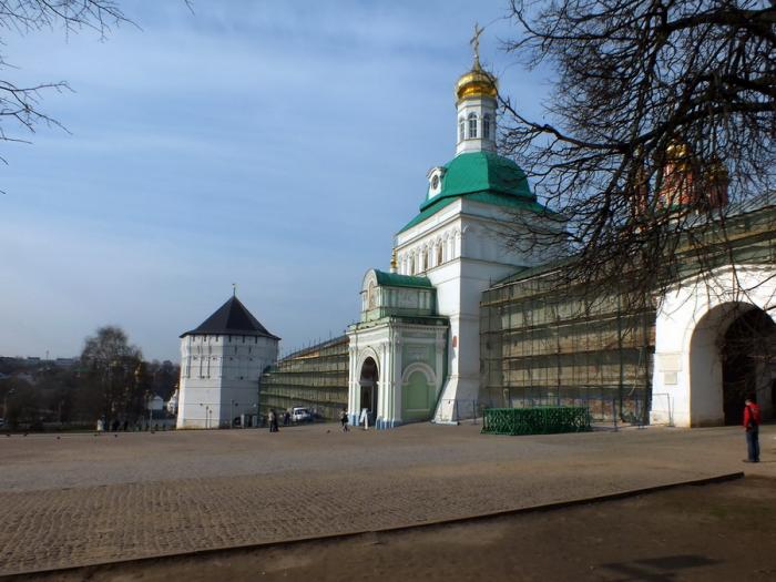 Сергиев Посад — это прежде всего, конечно, Троице-Сергиева Лавра. Здесь нас ожидал сюрприз — большая масштабная реставрация, укрывшая от взора великолепные храмы зелёными «платками».