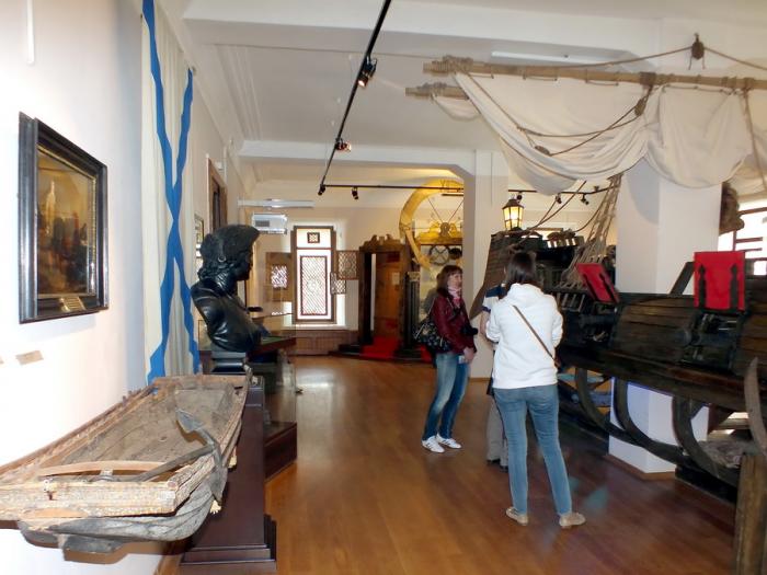 Рядом на горе музей-усадьба «Ботик Петра». Там хранится единственное уцелевшее судно из потешной флотилии, построенное руками самого самодержца. Один из самых первых провинциальных музеев России, открылся аж в тысяча восемьсот третьем году, именно для обозрения упомянутого ботика «Фортуна». Поднимаемся наверх в музей