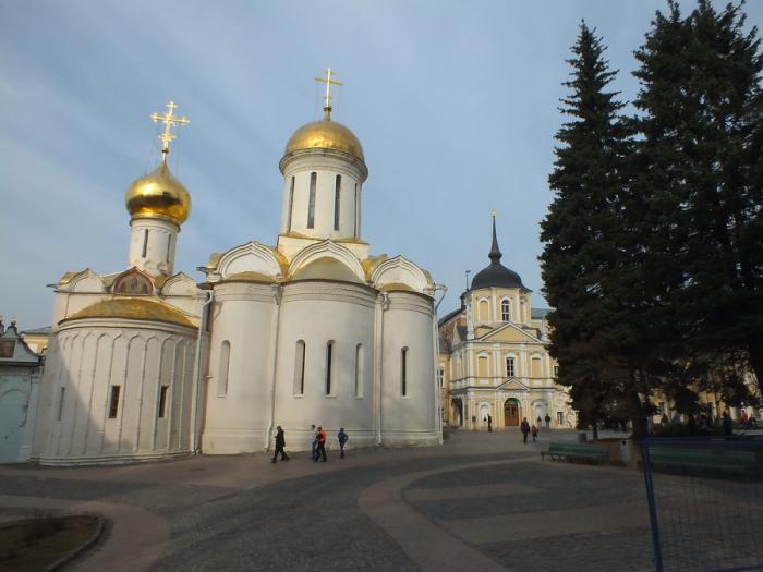 Далее расположен Троицкий собор Лавры. Его расписывали А. Рублёв и Д.Чёрный. Именно для иконостаса этого храма была написана Рублёвым «Троица». Главный собор Троицкого монастыря, основавшего Лавру, здесь в серебряной раке покоятся мощи Преподобного Сергия Радонежского. В советское время началось массовое изъятие церковных ценностей и мощам угрожало реальное уничтожение. Но нашлись смельчаки, которые подменили голову Сергия на другую, взятую из захоронения князей Трубецких.