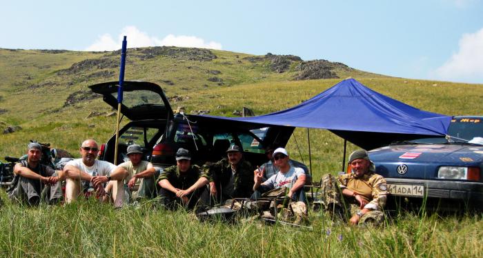 Утром – подъем в шесть часов, когда еще толком не рассвело. Лагерь наш спрятался в горном распадке, где лежит глубокая тень. Юрин «Утюг» еще с вечера погружен в кузов «Газели», туда же отправились лишние (и не слишком лишние, но тяжелые) вещи. Дальше мы едем налегке. Хотя «налегке» — относительное понятие, машины, которые пойдут дальше, загружены в общем-то под завязку. Из транспортных средств у нас остались две машины («Субару-Легаси» и «Фольксваген-Пассат») и два мотоцикла. Команда – семь человек (эх, прямо так и напрашивается аналогия со старым советским фильмом «Семеро смелых», надо же!)…