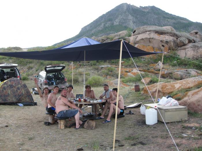 К вечеру, проехав через живописный горный распадок, мы подъехали к горе уже с северной стороны: именно там живет Толеген. Однако нам не повезло, хозяина дома не оказалось, он в отъезде, в райцентре Баянаул. Будет только на следующий день. Выяснив дорогу, мы продвигаемся как можно ближе к Аулие. И здесь, уже практически на горном склоне, разбиваем свой бивуак, ставя машины параллельно друг другу и натягивая между ними тент. Тент этот всю дорогу так и кочует между небом и землей, оказываясь то над нашей головой, то под нами, в качестве лежака, – когда нет времени или возможности ставить палатки.