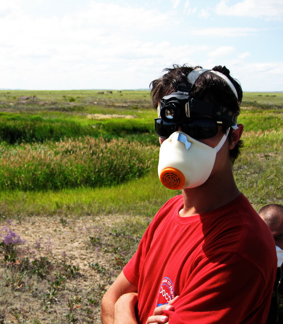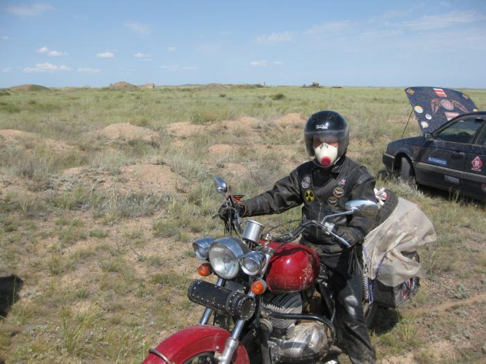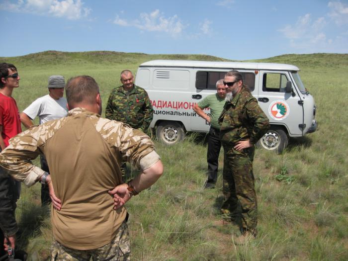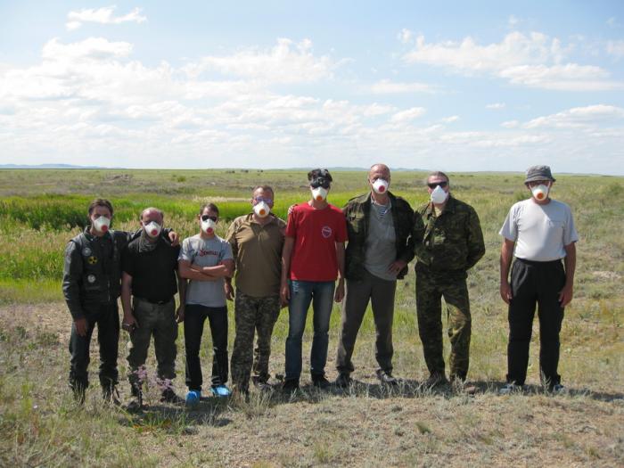 УАЗ-452 с броской надписью: «Национальный ядерный центр. Радиационный контроль» тормозит на пересечении двух степных дорог, и мы знакомимся с нашими провожатыми по полигону. Трое колоритных крепких мужчин в униформе, один из них – дозиметрист, который будет следить здесь за нашей безопасностью. Нас коротко инструктируют о правилах поведения на полигоне, а Павел раздает всей нашей группе респираторы. Пыль на полигоне – наиболее опасна.