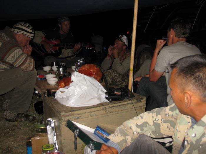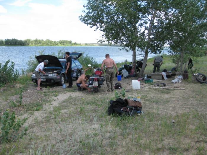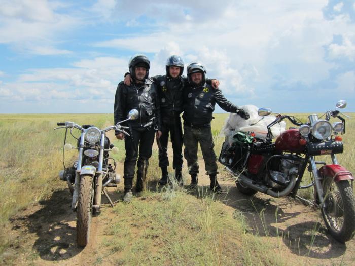 Сегодня воскресный день, и мы проводим его соответствующим образом, отдыхая от наших странствий по степям, отсыпаясь и отъедаясь. Семипалатинцы привезли в люльке мотоцикла живого барана, зарезали и разделали его на наших глазах. Леша-Дизель, один из авторитетных местных байкеров, вместе со Старым (Даулетом) сами приготовили несколько мясных блюд, вкусных и сытных, которые мы даже всей большой командой из павлодарцев и семипалатинцев едва одолели. Весь день «на огонек» заглядывали местные мотоциклисты, прослышавшие о нашем приезде. Пели песни под гитару, разговаривали по душам и даже спорили. Я впервые познакомился с байкерской субкультурой, что называется, изнутри. С этими ребятами не соскучишься. Сообщество байкеров состоит, в основном, из людей бывалых, очень подвижных и легких на подъем. Большинство из них активно путешествует, много чего видит и знает. Народ в целом коммуникабельный и раскованный.