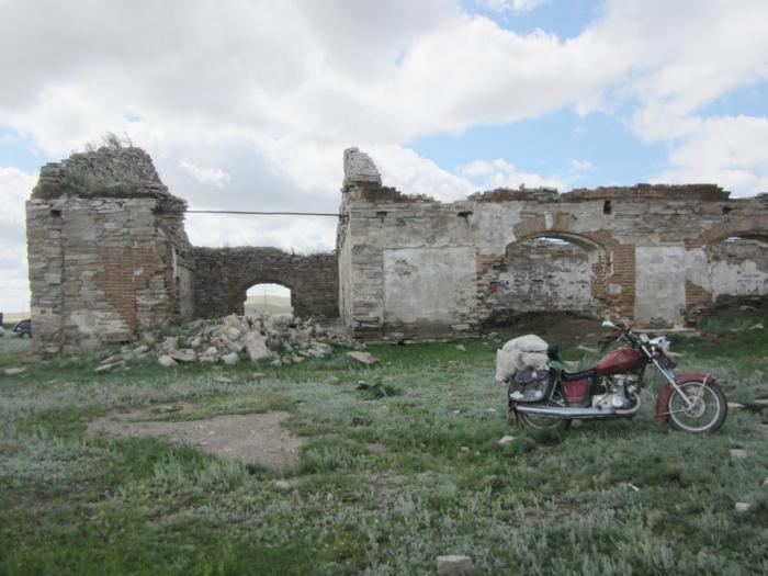 Порасспросив местных (и раздав им буклеты с информацией о нашем путешествии), мы выбрались на самый край села. Вот они – остатки когда-то знаменитой на всю округу перворазрядной Кояндинской ярмарки, действовавшей с первой половины 19-го века. К началу прошлого века ее годовой торговый оборот составлял около трех миллионов рублей, к 1913 году он достиг цифры в 13 миллионов – колоссальные по тем временам деньги! Сама ярмарка занимала в степи территорию длиной 11 километров и шириной 5 километров – можно представить, сколько времени требовалось для того, чтобы просто обойти ее ряды. Здесь были построены банки, трактиры, полицейские участки, здание суда, почта, телеграф, жилые дома…