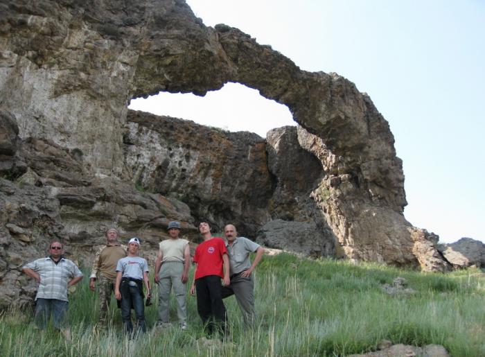 В этих горах я бывал тоже давно, еще в 80-х. Там есть несколько интересных мест, которые хотелось бы показать своим спутникам. Но дорога туда проходит по пересеченной местности, труднопроходимой для наших городских машин. В прежние годы я проезжал здесь на телевизионных «УАЗиках», а теперь каждый километр дается с большим трудом. Немного проще мотоциклистам, Косте и Славе: двухколесная техника маневренна и, соответственно, обладает более высокой проходимостью. Хуже всего приходится Николаю на «Фольксвагене», для его переднеприводной и низкопосаженной машины эти дороги явно не по зубам. «Губу» он окончательно доломал еще по дороге в Коянды, а теперь, на очередных каменистых «порогах», которыми усеяна дорога, у него трескается пополам задний бампер. Это уже слишком! Николай громко ругается, говоря, что ехал сюда не для того, чтобы помирать (это о своей машине), и дальше в этом направлении двигаться он не желает. Правда, мы уже добрались до пещеры Тас-Кура, в которой, по рассказам местных жителей, побывал в свое время первый президент Академии наук Казахской ССР, доктор геолого-минералогических наук Каныш Сатпаев.