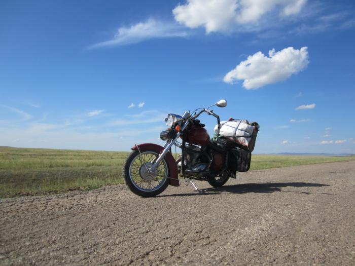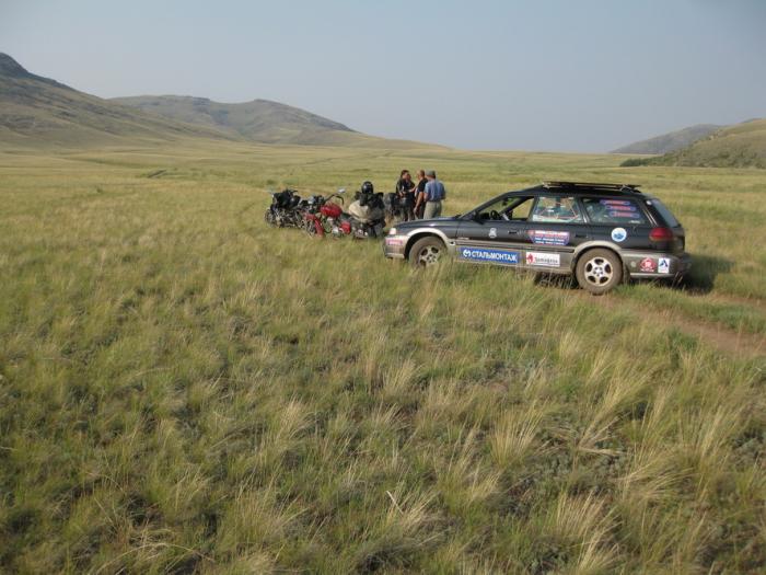 Пару раз мы теряем свою «тропу» — настолько она мало накатана (а на бумажных картах вообще отсутствует). И каждый раз нужно приложить усилия, чтобы вновь выбраться на подходящую дорогу. Иногда эта дорога начинает уводить в сторону от нашей цели и тогда приходится искать новую, утюжа степь на мотоциклах. Машины в это время ждут стоя на месте.