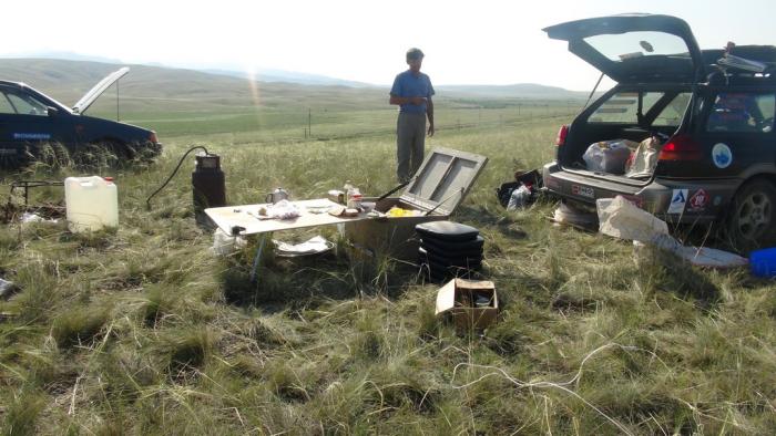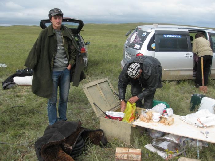 Утром к нам на вершину холма пожаловали гости, местный хозяин–животновод вместе со всем своим семейством. Его старая «Волга» с трудом забралась на высокий холм. Ночью он видел наши огни и решил проведать, что за люди появились в здешней глухомани. Как объяснил наш гость, здесь лежат земли каракесеков (каракесеки — подразделение племени аргын в Среднем жузе) и он один из них. Это его родовые земли. И мы не можем проехать мимо, не навестив его жилище, не пообедав вместе с ним. Мы все же вежливо отказались, сославшись на долгий и трудный путь впереди, по совершенно незнакомым дорогам…