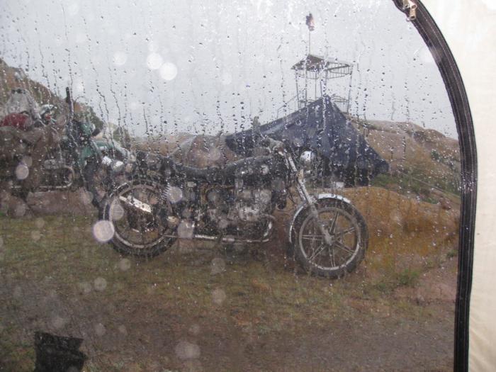 Но не тут-то было. Едва Илья с Николаем собрались выйти из лагеря, закапал, все убыстряясь, дождик, который очень скоро превратился в настоящий ливень. Поначалу он всех развеселил, под ним помыли машины и даже искупались сами. С мылом, как под душем. Прошло полчаса, потом час, ливень не только не стихал, а даже усилился. Порывистый ветер трепал тент, под которым мы расположились, пока, наконец, не расшатал его до такой степени, что пришлось держать тент руками, чтобы его не сорвало с центрального шеста. Стало откровенно холодно, с гор потекли потоки воды, целые полноводные ручьи, один из которых протекал прямиком через палатку, в которой ночью спали мы с сыном и где лежали все наши вещи.