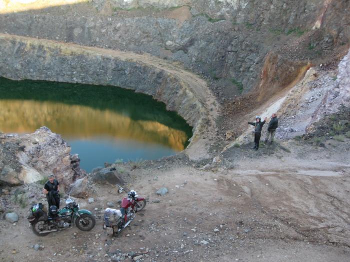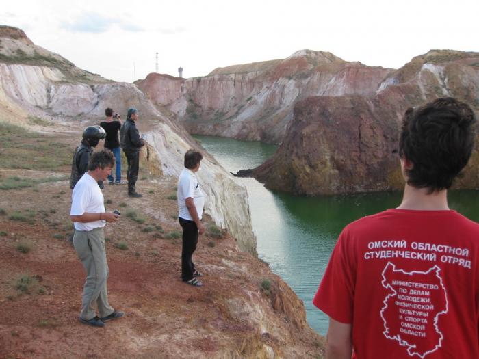 От чая, который нам предложили в гостевом домике, мы отказались: время поджимало. К вечеру нужно попасть на озеро Торайгыр, где у нас назначена встреча с еще одним участником нашей экспедиции, Николаем, который приедет завтра туда на своей машине из Павлодара. А по пути хотелось еще завернуть на заброшенное месторождение «Сувенир», который в свое время разрабатывало АО «Майкаинзолото». На «Сувенире» два очень красивых карьера, наполненных изумрудно-зеленой водой, и масса интересных камней. Мне, как человеку разбирающемуся в минералогии, там можно бродить часами. Но солнце уже клонится к горизонту и на все про все у нас остается минут двадцать. Байкеры, правда, успевают развлечься тем, что сталкивают с высокого обрыва огромные каменные глыбы и весело наблюдают, как они с шумом и брызгами обрушиваются в воду. Громкое эхо мечется вдоль стенок карьера, хохот и громкие голоса заметно диссонируют с марсианским красно-коричневым пейзажем из вывернутых наизнанку земных недр. Это место вообще-то привыкло к тишине. Люди давно покинули его…