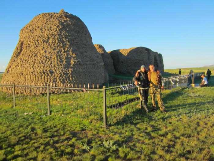По пути нам в степи встретились несколько разграбленных курганов. Копал, видимо, кто-то из местных — варварски, с использованием тяжелой техники, абсолютно безграмотно. Не знаю, удалось ли найти что стоящее в этих захоронениях. Древние – они ведь тоже были не лыком шиты. Уже после «Туган Жера», в конце августа, мы с сыном побывали на юге, в городе Есик, где в 70-е годы нашли знаменитого Алтын Адама («Золотого человека»). Так вот, центральное захоронение там тоже было разграблено еще в глубокой древности. Но Алтын Адам был обнаружен в пятнадцати метрах от центра кургана, практически на его краю. И нашли его, в общем-то, случайно, когда бульдозер при расчистке площадки под строительство автобазы, зацепил сруб из окаменевшей лиственницы…