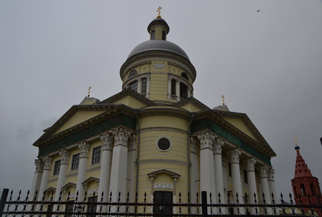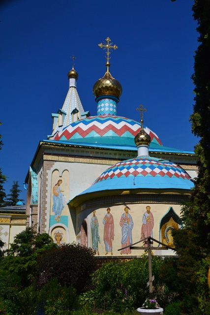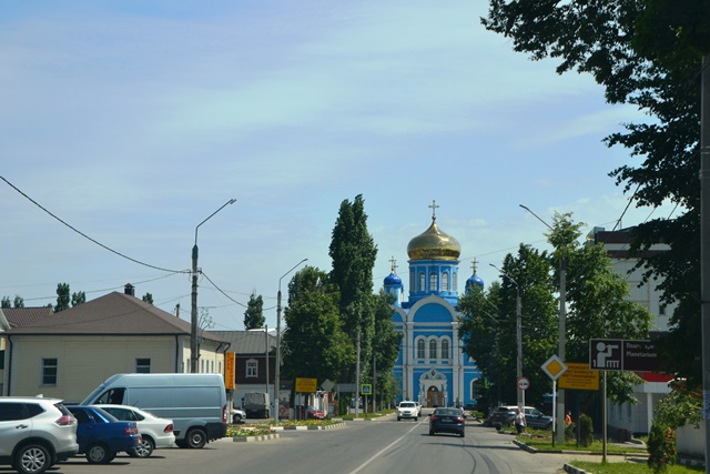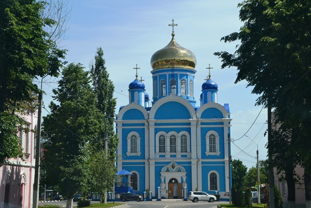 Собор ярчайшего лазурно-золотого цвета открыт и виден издалека: едем по центральной городской улице, упирающейся ровнехонько в здание храма.
