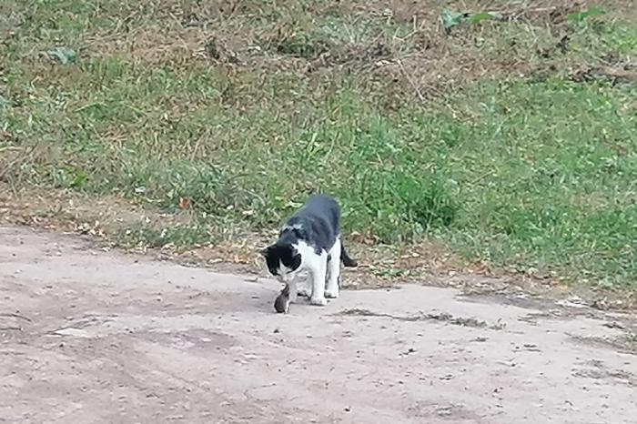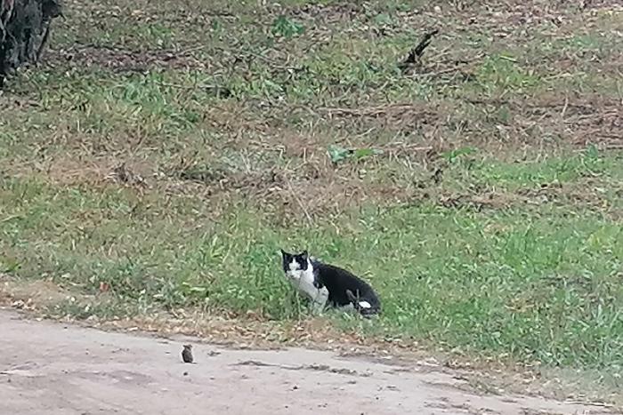 Нашу прогулку под вековыми липами нельзя назвать умиротворенной: на дорожке развернулась настоящая драма. Или комедия. Кошка развлекалась пойманной мышью: не убивала – но и не отпускала. Мышь в свою очередь бесстрашно смотрела прямо в морду врагу и не делала никаких попыток умотать в спасительные охапки вырубленного подлеска. Картина для меня была весьма противной: я ни кошек, ни мышей не люблю, так что фотографировала очень сильно издалека и не присматриваясь к экрану телефона. Но на всякий случай размещаю, для создания колорита местности, так сказать.