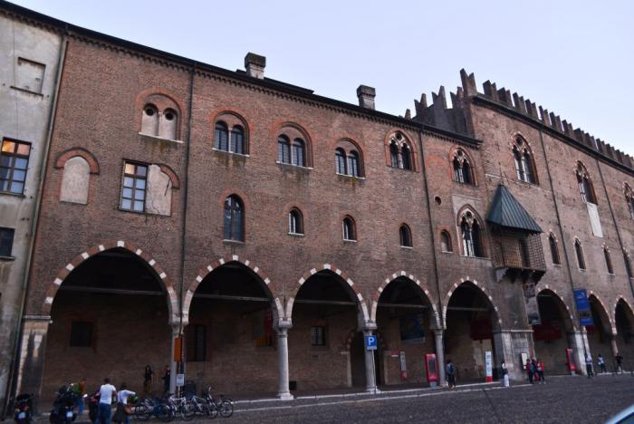 По периметру Piazza Sordello расположены тяжелые громадины старинных палаццо. Например, темное кирпичное здание —