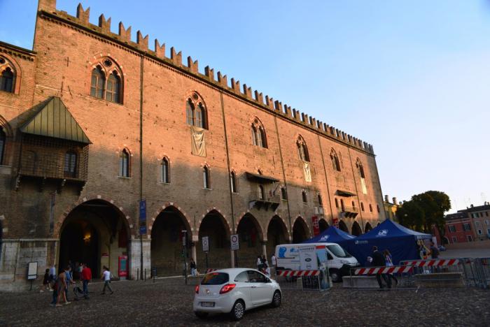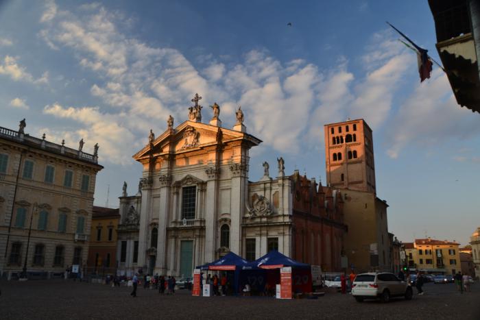 Исторический центр с трех сторон окружен водой, что наводит мысли о тотальной защищенности города в лихие времена. Сейчас через воды охватывающего север городского исторического ядра озера проложено несколько мостов – по одному из них мы попали к парковке, стратегически удачно расположенной между палаццо Дукале и Мантуанским собором, «мелочь-но-приятно» бесплатной по случаю субботнего вечера.