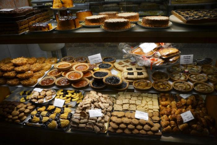 Из манящего великолепия было выбрано несколько наименований выпечки, в очередной раз поколебавшей наши надежды по части итальянской еды. В кофейне, где мы привыкли обедать дома, кростата – это основа из хрустящего теста со слоем яблочных лепестков, залитых тонким скрепляющим слоем желе. Настоящая итальянская кростата являла собой довольно грубую по текстуре корзинку песочного теста, залитую джемом.