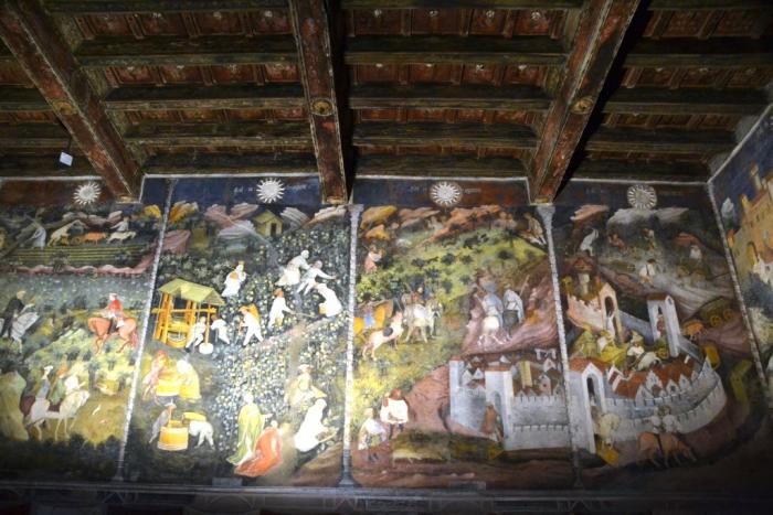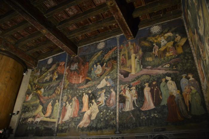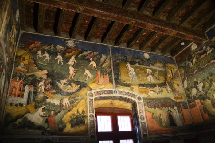 Каждому посетителю выдается аудиогид, который в течение 15 минут на итальянском, английском или немецком языках (информации на русском нет нигде в замке) будет вещать о том, что уникальные фрески в XV веке выполнил неизвестный мастер из Богемии. Он с предельной точностью изобразил смену времен года, рассказав на 12 фресках о типичных занятиях жителей Тренто на протяжении 12 месяцев в году.
