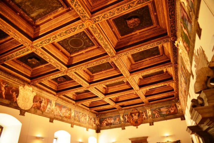 Да и мастерски выполненные кессонные потолки в этой части замка заставляют вспомнить высокие образцы этого вида искусства (например, в Венеции):