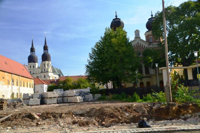 синагоге, чей силуэт оригинально рифмуется с громадиной базилики Святого Микулаша:
