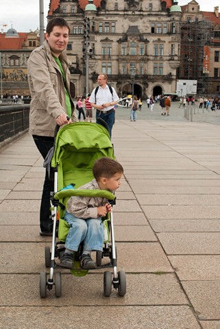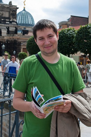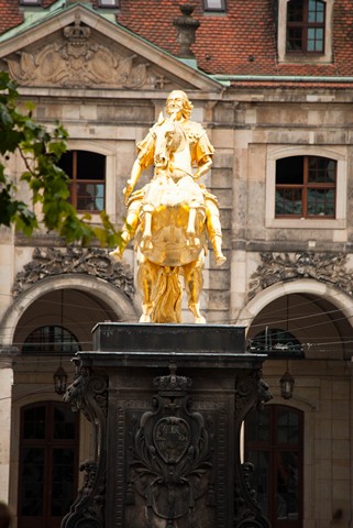 Поставили палатку на все растяжки, что у нее были, дабы не сдуло, и начали искать где бы плотненько покушать. В кемпинге есть кафе – то там кормить сегодня почему-то не собирались. После безуспешной попытки найти ресторанчик в округе, приняли решение покатить в сам Дрезден и покушать там. Включил в навигаторе отображение жрален. Сначала искали на окраине города, но, после того, как все найденные жральни оказались закрытыми – рванули в самый центр. Желудок дает о себе знать. Накапливается раздражение и усталость. Но, наконец – мы видим то, что нужно! А именно: фонтан, статую «Медного Всадника», отлитую из золота и кафешки, где сидит местный люд и что-то усиленно наворачивает. Ура! Находим где припарковаться и радостно бежим на запах пищи. Разместились за столиками на улице. Сделали заказ. Чтобы Мишка не разгромил кафе – официантка принесла ему раскраску и карандаши. После чего, на некоторое время он занялся каляками-маляками. Поели. Порции у немцев огромные. Съесть смогли не все. Пища была непривычна и давалась с трудом. Суп — слишком густой (почти как картофельное пюре, в которое порезали сосисок), второе – суховато и солоновато. Мы привыкли к иной пище. Кстати, от сухости и солености блюд мы страдали по всех странах, кроме Польши. Может, просто не то заказывали?