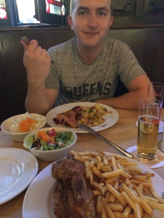 Меню нам нашли на русском, но там не полный список, что в меню на немецком. Порции большие. Обычно состав порции это салатик, какое-то мясо (сосиска, половина цыпленка на гриле или еще что) и гарнир.