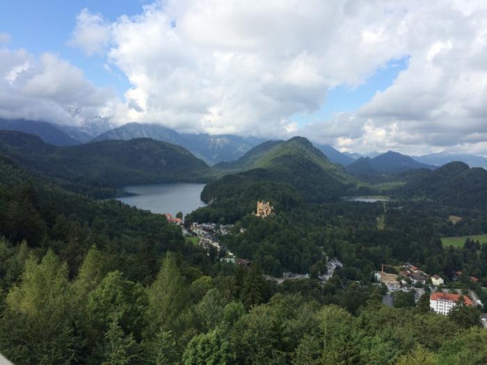 На этой территории вообще два замка, еще один называется Хоэшвангау. Но он менее красивый, мы в него не пошли. На этом фото его видно среди леса и гор. Желтенький такой.