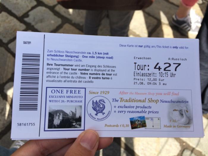 Вот так выглядит билет, стоимость одного 12 евро. Посещение строго по времени. Перед замком есть табло, на котором написано ваше время и ваш номер.
