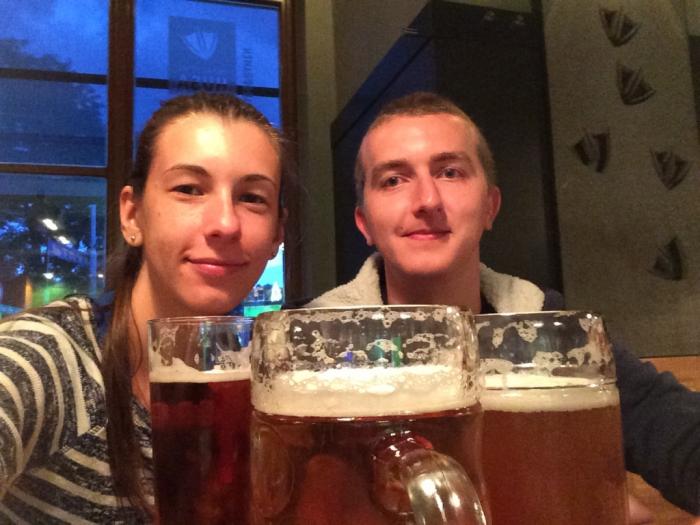 Меню есть на русском. Пиво продают в литровых кружках (где-то 8 евро литр). Территория пивной очень большая, народу полно, мы искали место чтобы присесть. Внутри очень душно, все громко разговаривают и свет тусклый. Во дворе было полегче.