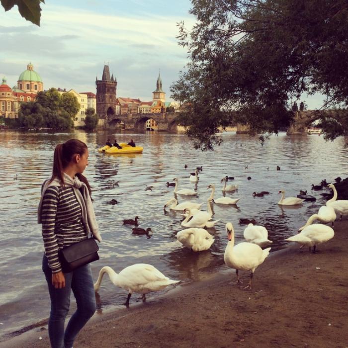 Рядом с мостом есть прекрасное место с лебедями, их можно покормить.