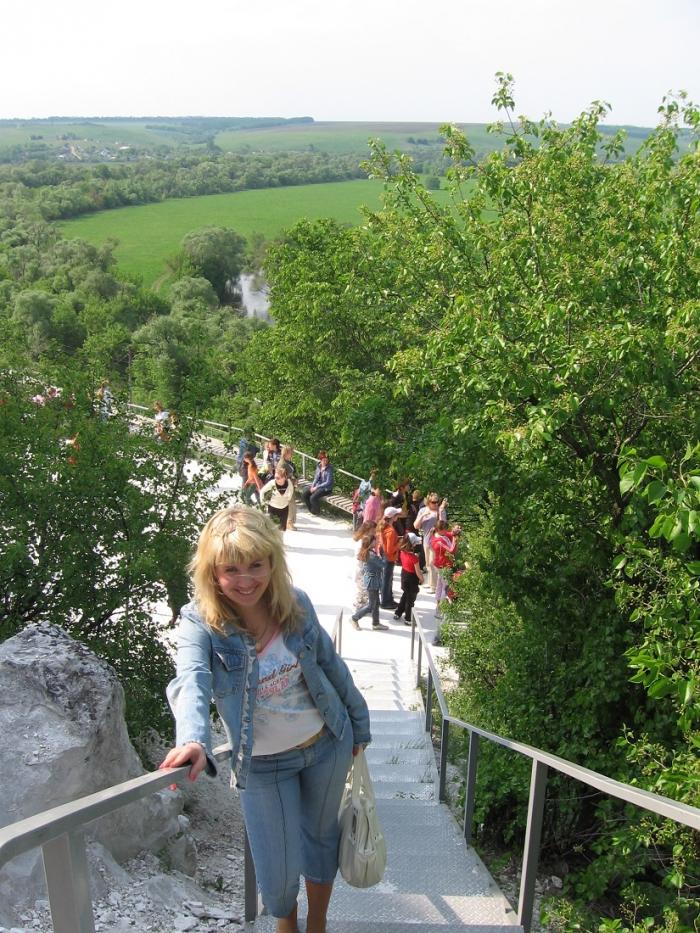 Осмотрев меловую церковь внутри и пройдя по её узким и темным проходам (именно поэтому ожидали экскурсию), полюбовались красивыми пейзажами, открывающимися со смотровой площадки, мы сделали несколько фото на память и спустились к р.Тихая Сосна. Промежуточный итог: проехали 150 км за 1ч. 40 мин.