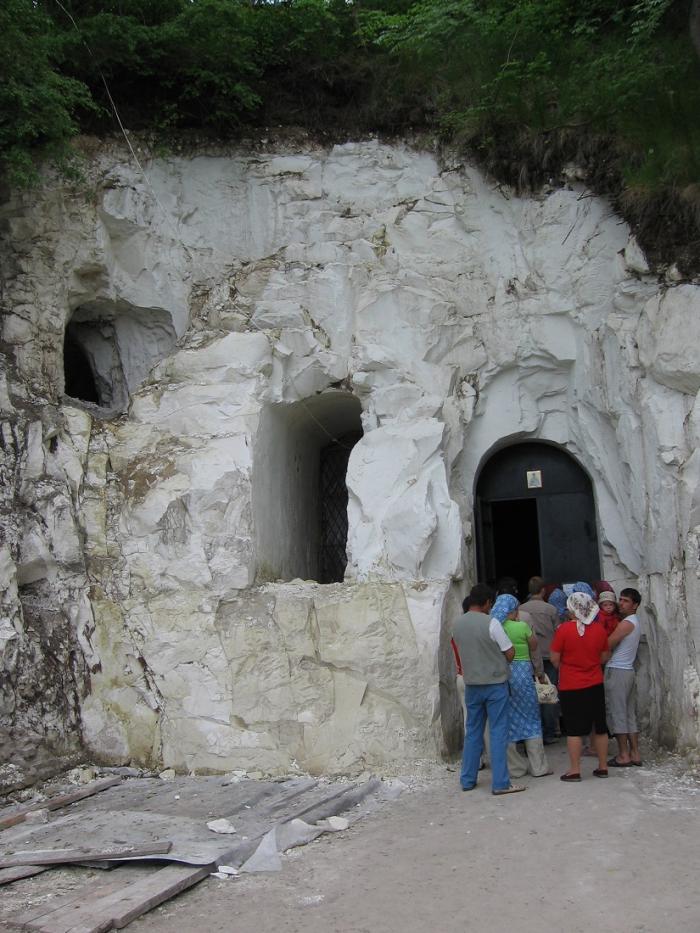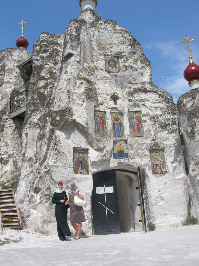 В этот же раз мы попали на начавшуюся в храме службу. Девчонки осмотрев окрестности внутрь не пошли, т.к. до этого на пикничке пригубили пива. А я, мечтавший полазить по самому длинному подземелью искусственного происхождения в России, ограничился посещением пещерного храма. На всей территории храма шли восстановительные работы, которые прерывались на время Богослужений.