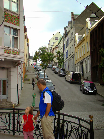 Пошли шататься по городу. Без предварительной подготовки экскурсия по городу сводится действительно к блужданию по улочкам, куда кривая выведет. Но Олесунн настолько маленький и круглый, что кривая выводит все время к площади с домом-лебедем, памятнику морякам, и старушке с корытом рыбы. Еще все время мы спотыкались об один и тот же киоск с фастфудом (кебаб), у меня сложилось впечатление, что он там вообще один.